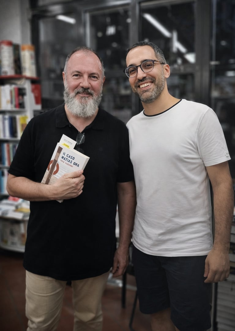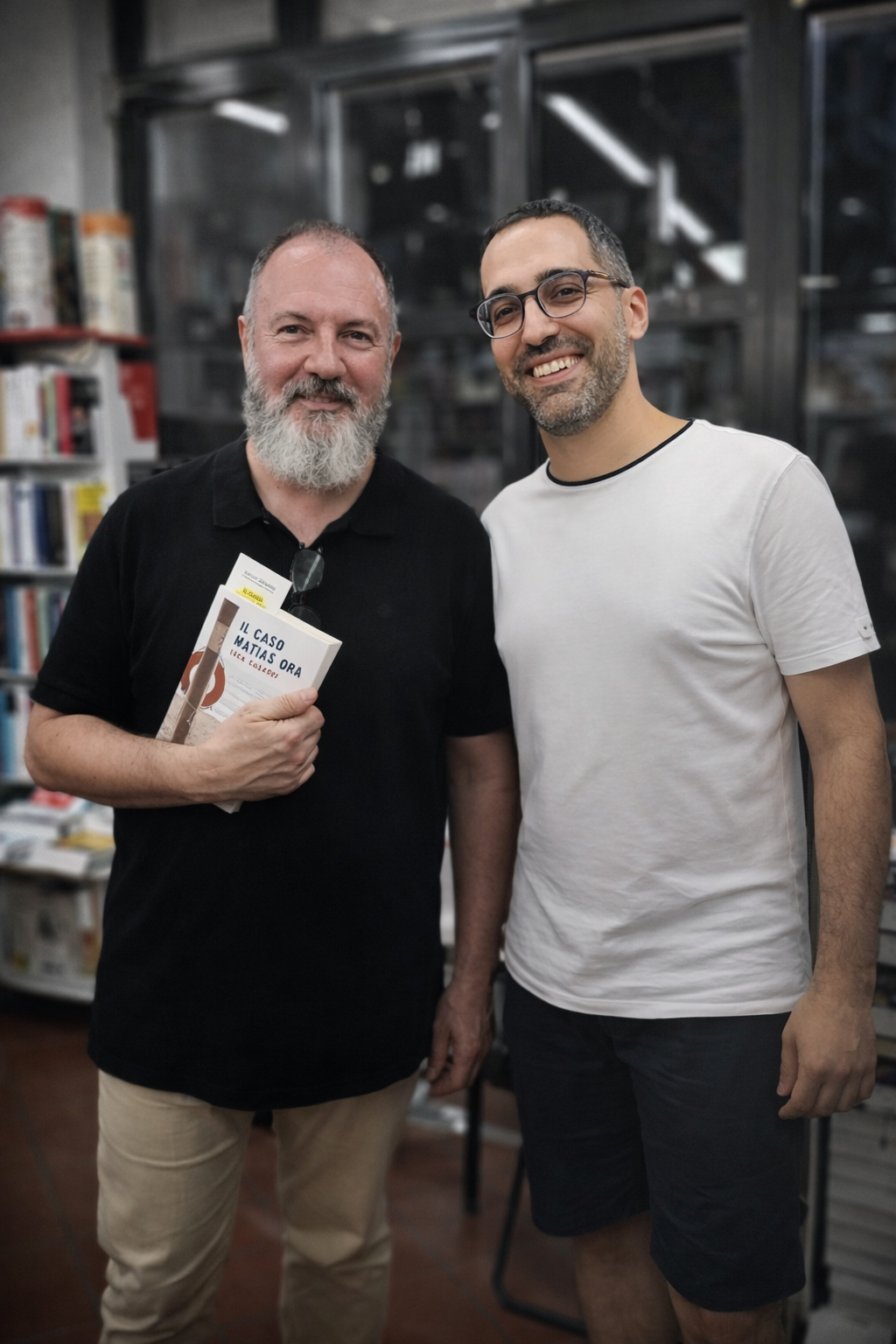 Ho incontrato Carlo Lucarelli a Cesenatico il 25 luglio 2022 in occasione di un mio firmacopie del romanzo Il caso Matias Ora alla libreria Mondadori. Sapevo che si trovava in zona appena l’ho visto ho colto l’opportunità per donargli una copia del libro e ringraziarlo per quello che aveva rappresentato nel mio percorso. In realtà non è stata la prima volta che l’ho incontrato, mi è capitato più volte di partecipare a incontri in cui era presente. La prima volta è successo nel 1999, quando da studente liceale partecipai al Premio Bancarella recensendo il suo romanzo L’isola dell’angelo caduto. Gli ricordai proprio quell’episodio, di cui ancora oggi mi ricordo alcune frasi che pronunciò e che mi sono rimaste impresse. Cosa mi piace di più di Carlo Lucarelli? La cura per le ambientazioni e le atmosfere, lo stile evocativo, alcuni personaggi indimenticabili.